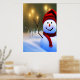 Un bonhomme de neige blanc avec du beanie rouge et une écharpe debout dans le parc avec des mâts légers dans l'arrière - plan. C'est un art généré par l'IA.