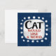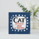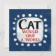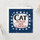 Un dessin animal typographique irrévérencieux et mignon qui dit "Chat aimerait un mot". Il présente du texte noir et rouge sur un rectangle blanc avec des points blancs amusants et amusants qui l'entourent, le tout sur un arrière - plan bleu.