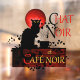 Note card with "Black Cat and Black Coffee" is based off Théophile Steinlen's classic black cat posters for "Le Chat Noir" club. This design features his famous black cat sitting on an ivy-covered brick wall with a large cup of coffee. Steam and hearts are coming out of the coffee cup and a bright red full moon.