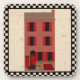 Ce Dessous de verre en liège de Brownstone dispose d'une charmante maison en pierre de Brownstone avec volets rouges.