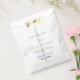 Son premier papier de Merci de communion sainte Favoriser les sacs avec simple croix d'argent peinte à la main avec des accents d'or. Personnalisez le nom dans le script bleu et la date dans le texte noir contre l'arrière - plan blanc. Oeuvre et design graphiques d'origine © TamiraZDesigns.