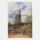 Le Moulin de la Galette by Vincent van Gogh is a vintage fine art post impressionism architectural painting featuring a windmill at the top of a hill in Montmartre, France with a farmer working his field.