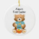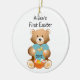 Personnalisez le nom de votre enfant First Easter Day Ornament 2012, avec un ours en peluche tenant un grand coeur turquoise, et un panier de Pâques, et des papillons sur ses pieds. Tout le texte personnalisable.