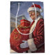 Trump habillé comme le Père Noël tient un grand sac rempli de cadeaux emballés devant une Maison Blanche enneigée. Le texte peut être modifié.