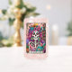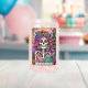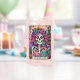 Design coloré et dynamique avec une carte tarot amusante avec un squelette féminin. Le squelette a des cheveux roses sauvages avec des fleurs dedans, un crâne de sucre, et tient un livre ouvert. Le texte coloré dit : "Le ver de bibliothèque". Ce design est disponible sur une grande variété de produits.