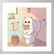 A cute art image of a fuzzy white cat reading a book in a concentrated manner while sitting comfortably on the toilet. This humorous and charming illustration adds a playful touch to any room, perfect for bathing room decoration or as funny wall decoration in the house. Ideal for cat lovers and enthusiasts of unique, peculiar works of art.