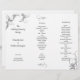 White tri-fold wedding program template with silver grey leafy flourish and text to match. Customize three sections with ceremony information and fold accordion style.