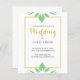 Contemporary white wedding invitation with a thin gold border and leaf motif on top and bottom of card. Colours and text are completely editable online with a few clicks but if you need help contact designer at ArtByLiz@gmx.com and card will be customized for you at no extra charge.