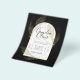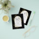 Introducing a softly formal black tie wedding item with black and gold colours adorned with delicate gold skeleton leaves overlaying the borders of an arched frame. This design is part of a coordinating collection and includes items such as RSVP cards, save the dates, invitations, welcome signs, stickers, napkins, programs, table number cards, favour bags, menus, and wine bottle labels, as well as a variety of card and paper types to fit any budget.