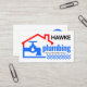 Cover features a home building frame that is leaking water from the faucet. Card details are over on the right with your prestigious name at the top followed by the business name "plumbing" in blue and a slogan caption option; Change the captions to these items to suit your own service needs. Overleaf, at the top is the blue faucet logo you can use followed by your prestigious name and the contact details.