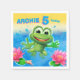 Leaping Frog custom party paper napkin. One of my favorite illustrations. This little leaping frog loves birthdays and parties so much that he's jumping right out of the picture. Perfect for any kid's party ware, you'll find her on cards, invites and plates and various kids apparel. All with customizable ages and names for the perfect tailored party.