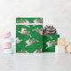 Leaping Hare Christmas Wrapping Paper features a leaping hare (rabbit) in a red Santa hat on a vibrant green background hand painted in watercolor on textured paper.