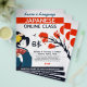 This vibrant yet professional flyer design template is perfect for promoting an online Japanese language class. The design features a Japanese geisha and nature elements in a rich red and navy blue colour scheme. The template includes editable sections for all your key information: titles, class times, dates, prices, registration details, and contact information. Additionally, the bold Japanese characters say "Japan" and add a culturally authentic touch, blending modern and traditional design elements seamlessly. Whether you're a seasoned educator or just starting your language teaching journey, this flyer template offers a fun and engaging way to captivate potential students while maintaining a polished, professional look.