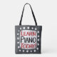 "Learn Piano Today" is a cute text design in grey with black and red text. It sits on a white accent shape and cute white polka dots surrounding it.