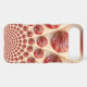 The artwork showcases a central cluster of red cricket balls that radiates outwards in a concentric, spiralling fashion. The balls vary in size, suggesting depth and perspective. The background is a soft, textured off-white, providing a subtle contrast that highlights the rich red of the cricket balls. The overall effect is visually engaging and creates a sense of organized yet dynamic movement.
