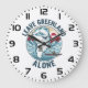Keep track of time with a view of the Arctic using this Leave Greenland Alone clock. This decorative wall clock features a serene illustration of the Greenland landscape, including whales and snowy peaks. It is a beautiful functional piece for a home office, living room, or cabin. The calming blue tones and meaningful message make it more than just a timepiece; it is a tribute to the enduring spirit of the northern frontier.