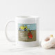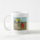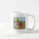 This cute cup shows a man with a backhoe, clearing off that last lump of dirt, which is really the horns of an underground dragon. "Leave well enough alone" are the words of advice.