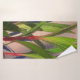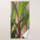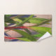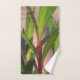 The retro fabric design by ZoeSPEAK on this Bath Towel Set was created from Zoe’s original photograph of long, thin green leaves in the late afternoon sunlight, throwing blue shadows on the stucco wall behind. The plants are Mexican petunias, with reddish stems. The mood is sleepy summer afternoon from earlier times.
