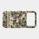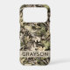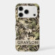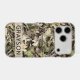 Customize this leaves camouflage iPhone 17 pro case with your name in a trendy modern CAP font in brown on opaque cream. It's masculine and perfect for your favorite military, hunting, country or outdoorsman!