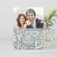 Lovely twenty fifth Wedding Anniversary invitation on pastel mint aqua background with an overlay of elegant silver leaves. Matching silver banner on front and back of card. Upload a special photo to replace this photo template placeholder. Customize the invitation front and back text with your information. This design is available on other items in my store.