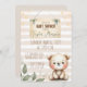 Welcome your little bundle of joy with this adorable baby shower invitation featuring a hand-painted watercolor teddy bear sitting sweetly on a soft striped background. Accented with gold stars, green leaves, and a vintage paper banner for your custom text, this design is perfect for a cozy, gender-neutral celebration full of warmth and charm. Ideal for moms-to-be who love cute, soft, and artistic stationery.