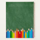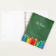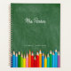 Un planificateur moderne et personnalisé pour les enseignants avec un arrière - plan en damier vert avec des crayons colorés. Nom de l'enseignant en script. Texte personnalisé en bas dans une police serif.