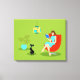 Cette Retro Reading Woman Stretched Canvas Print présente un style années 60, art minimaliste, dessin animé d'une femme qui a ses priorités dans l'ordre. Ce délicieux ver de livres est entrainé dans un vrai tourneur de page. La brunette, toute en forme, porte une robe d'aqua et des lunettes rouges, tout en tenant un livre bleu. Elle est assise dans une chaise confortable aux oeufs rouges. Devant elle, un chat noir élégant dans un col turquoise profite de la tranquillité qui vient de vivre avec un bibliophile. Femme et chat sont tous deux dans une élégante chambre verte. Au-dessus, une lampe pendentif kitsch dans les tons jaune et turquoise. Sur le côté, un plante luxuriant, tropical, en pots, est installé dans un aqua fleuri. Kitty, si vous avez besoin de quelque chose, vous devrez attendre jusqu'à ce qu'elle finisse ce chapitre !
