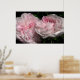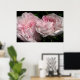 Leda is an antique Damask rose dating from the early 1800's. The petals are many and vary in colour from blossom to blossom. Creamy pink and often tinged with darker pink, she is also called the Autumn Damask or Painted Damask. This poster displays two blushing pink scented blossoms.