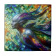 A stylized mermaid showcases a mosaic of shimmering tiles in vibrant hues of blue, green, purple, and orange. The lighting enhances its metallic lustre, while an abstract background complements its artistic form.