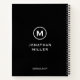 Modern left-handed notebook features a minimal design in a classic black and white colour palette. Custom name presented in the centre in stylish simple font with a complimentary minimal monogram medallion. Shown with a custom name and monogram initial on the front in modern typography, this personalized business notebook is designed with custom text you can customize by changing the text using the fields provided. The spiral is on the right for left-handed convenience.