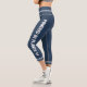 Ces leggings bleus sont ornés des mots "Powered by plantes", décorés de petits feuilles stylisés et de rayures blanches sur les deux jambes.