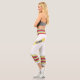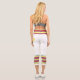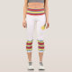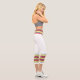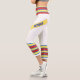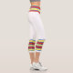 Three-tone design with retro style stripes on the lower legs. Horizontal five lines in solid blue, red and yellow. For your sporty white Capri leggings. Retro colors, personalized design. Add a personal touch to your outfit with your name on the left side of these high-waisted athleisure leggings.