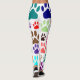Images of dog paw prints all over. Colorful cartoon design. Custom leggings for dog lovers. Venin idea for women and girls that love dogs.