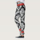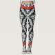Jambes rouges à motif damassé noir et blanc moderne. La majeure partie de cette paire de leggings est recouverte d'un motif damassé. Une bande rouge fait le tour juste sous la taille et sur chaque jambe et des rayures noires et blanches sur le dessus et au bas.