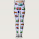 Ces leggings ont un design novateur de camions et de bus en rouge, bleu, vert et marron sur un champ de bleu clair.