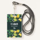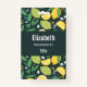 Personalized name badge with a cute pattern featuring yellow lemons and green lime fruit with stalks of leaves set on a dark green background.