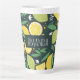 Latte mug with a cute pattern featuring yellow lemons and green lime fruit with stalks of leaves set on a dark green background.