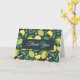 Greeting card with a cute pattern featuring yellow lemons and green lime fruit with stalks of leaves set on a dark green background.