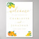 Modern Lemon and orange watercolor citrus wedding welcome gold foil poster. Unique watercolor painting of oranges and orange segments with green foliage and yellow lemons on a branch with greenery and lemon segments. Easy to customize stylish gold foil typography script with the bride and grooms name, the wedding date and your own welcome message. Original artwork by artist Catherine Sweetman