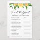 Find the guests. Mingle and chat with the guests to find the answer to the questions. | Add these fun and playful shower game card to your event. This customizable find the guest game card features watercolor illustrations of lemon and oranges with greenery accents. Personalize by adding your questions. This citrus shower guessing game card is perfect for summer baby showers and summer bridal showers.