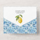 Desigbn features a vibrant, elegant design with blue Mediterranean-style patterns surrounding a central white oval. The monogram at the top adds a personalized touch, while the lemon illustrations provide a fresh, summery feel. The invitation details are presented in a classic, sophisticated font, inviting guests to a wedding at a picturesque location. The overall aesthetic combines traditional and bright elements, making it both timeless and lively.