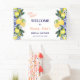 Elevate your bridal Shower with our Mediterranean Italian citrus lemon blue tiles welcome banner. This enchanting design features vibrant watercolor lemons and pink roses, complimented by intricate Mediterranean Italian blue tiles pattern with script" Ciao Bella" on pink lettering calligraphy on white. This banner promise to bring the allure of Mediterranean charm to your bridal shower summer party. Easily you can change your text, fonts and colours by clicking customisation tools. You can transfer this design on to variety of products effortlessly.