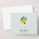 The design showcases a soft light blue background, framed by a whimsical cobalt blue swirl border on the top, left, and right, with a cheerful lemon branch illustration hanging from the top corner. Elegant typography and romantic flourishes complete the upper portion of the invitation, while the bottom features a tear-off recipe card, perfectly coordinated in style.