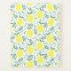 Lemon botanical pattern with a collection of bright canary yellow lemons, falling compound locust leaves, seed pods and sprouts in patina green, blue-green and greenish chartreuse. Set on white.