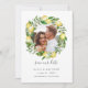 Elegant botanical save the dates feature a favourite engagement photo encircled by a round wreath of lemons citrus and leaves in an elegant watercolor palette of yellow, green and white.