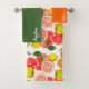 Lemon green orange citrus Pattern name Bath Towel Set. This bath towel set features a lemon, green, and orange citrus pattern. The pattern name is Bath Towel Set, indicating it's a complete set of bath towels with a consistent design. The citrus theme suggests a fresh and vibrant aesthetic for your bathroom. The towels are likely made of absorbent material for drying after bathing or showering.