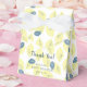 This cute baby shower favour gift box features a white background with pattern of yellow lemons and blue leaves. Change the background colour and personalize it for your needs. You can find matching products at my store.