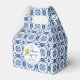 A pretty lemon bridal shower favour box decorated with lemons and Italian blue tile, with the words, she found her main squeeze. Perfect for your Italian blue tile lemon bridal shower guests. Designed for you by Blackberry Boulevard.