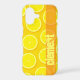 A bold coloured fruity iphone case in bright yellow. A great case for lemon lovers, clementines and other zesty fruits. In this very bright yellow colour finding your phone will be easy. Customize with your first name or family / surname / nickname. Currently reads Clement. Art and design by Sarah Trett.
