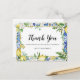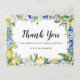 A lovely thank you note that features a blue mosaic tile border with a thin gold frame in the centre. Lemons, white flowers and sage green leaves are interwoven to create a modern botanical vibe. Thank you is written in a pretty modern calligraphy. Your name is below in an elegant text.
